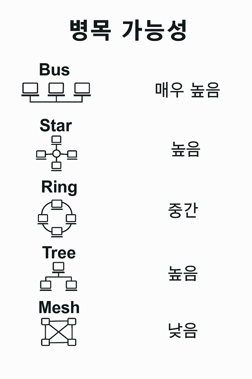 중앙 집중형 구조일수록 병목 가능성이 높고, 메시형처럼 분산된 구조는 병목에 강하다.